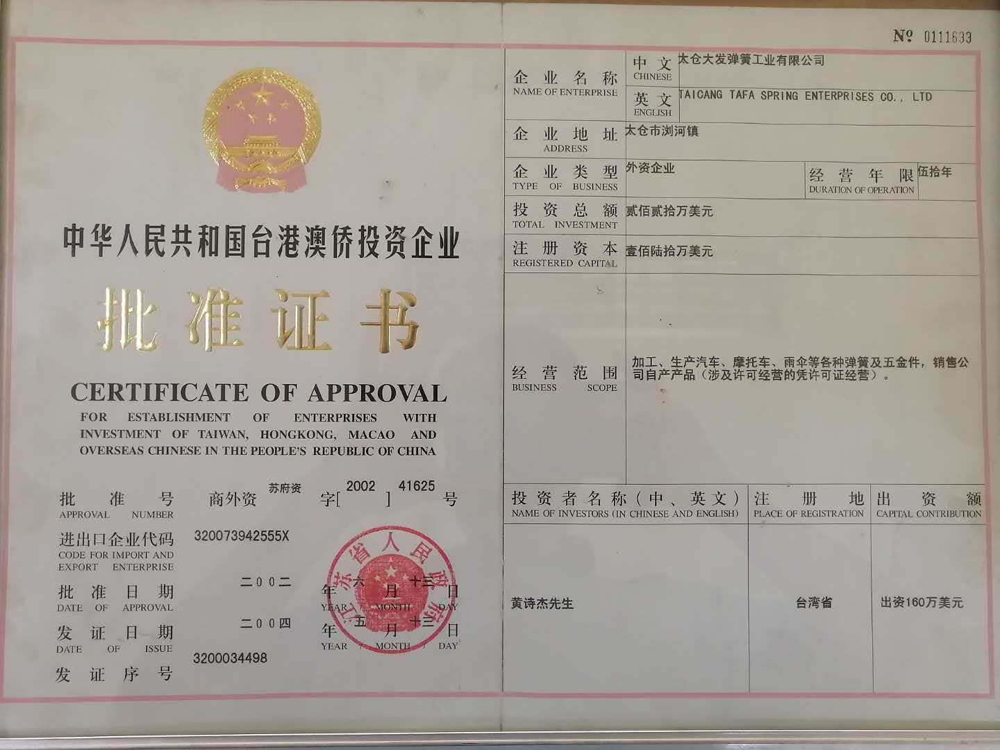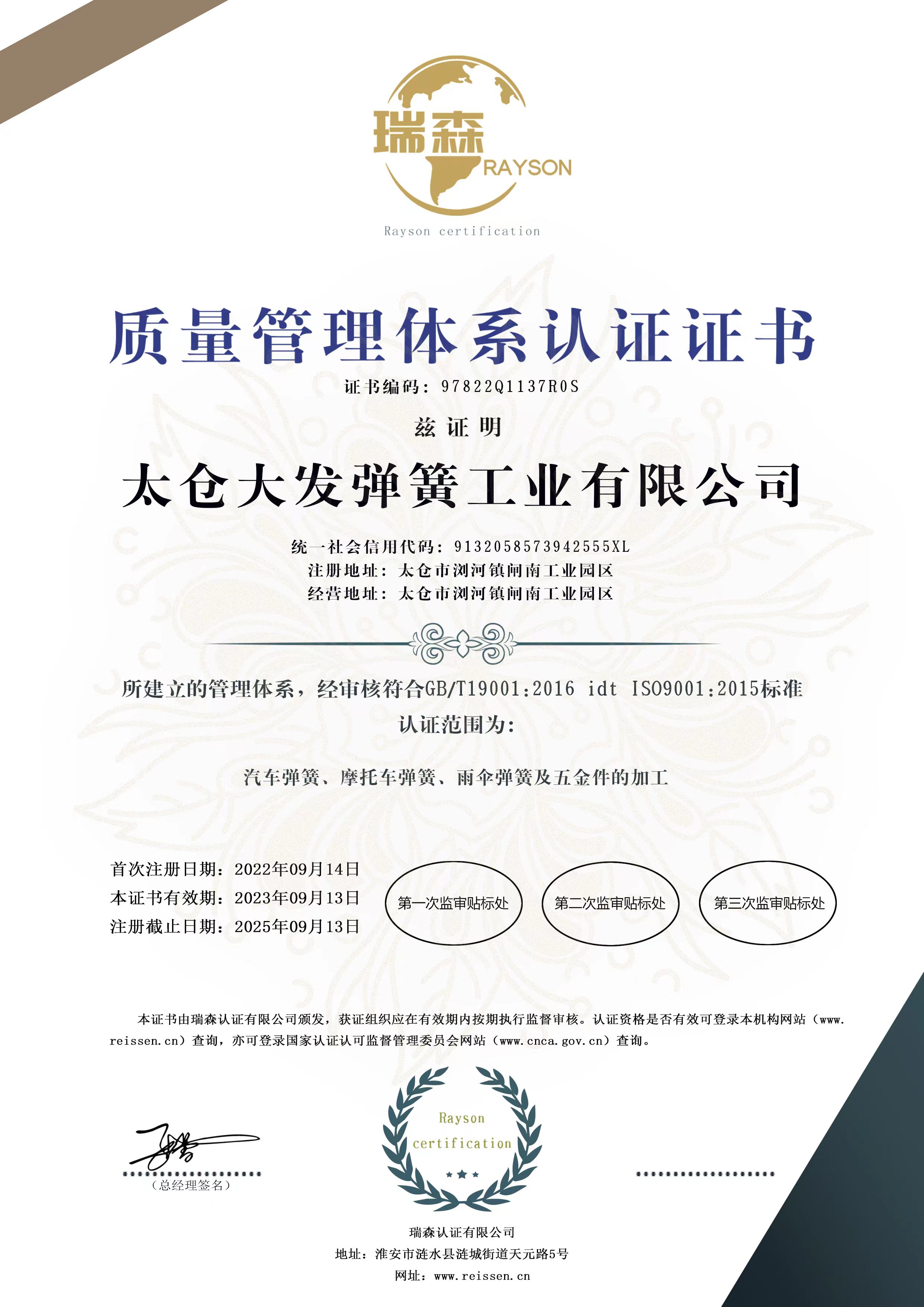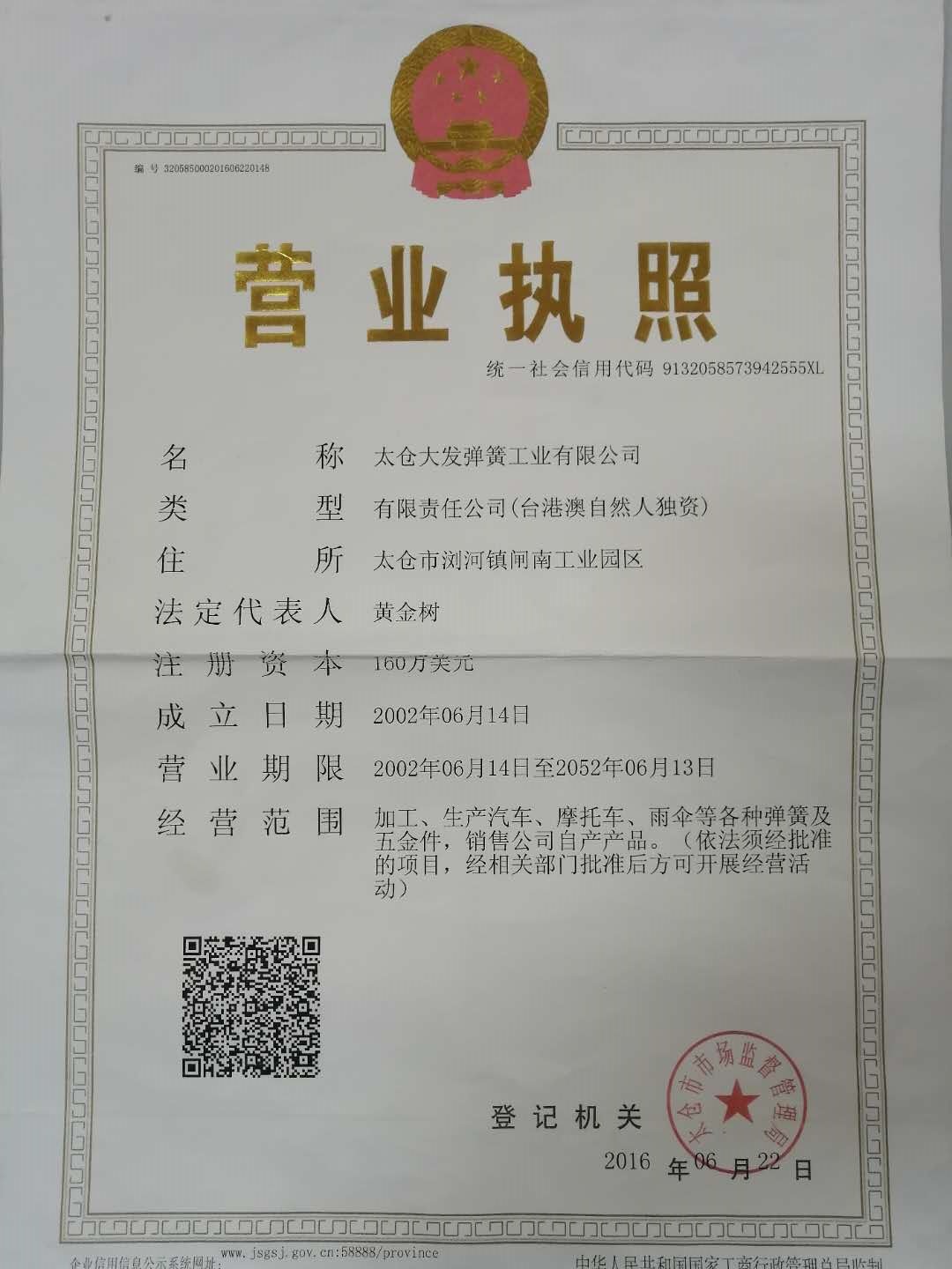 太倉(cāng)大發(fā)彈簧工業(yè)有限公司由黃金樹先生于1967年始創(chuàng)于臺(tái)灣,是一個(gè)集雨傘、電子、五金機(jī)械、自行車、摩托車、汽車等的彈簧配件生產(chǎn)、加工、輔助設(shè)計(jì)服務(wù)的綜合性企業(yè),其中1990年創(chuàng)辦的廈門大發(fā)彈簧公司、2000年創(chuàng)辦的深圳大發(fā)彈簧公司、2002年創(chuàng)辦的太倉(cāng)大發(fā)彈簧公司均位于經(jīng)濟(jì)發(fā)展地區(qū),地理位置佳。我們憑借在彈簧制造業(yè)的多年豐富知識(shí)與技術(shù),并著眼于以客戶為導(dǎo)向,秉持“以人為本,以質(zhì)為先,以客為主,持續(xù)創(chuàng)新”的經(jīng)營(yíng)理念,強(qiáng)化競(jìng)爭(zhēng)優(yōu)勢(shì)。公司導(dǎo)入ISO9001: 2000質(zhì)量管理體系,執(zhí)行ISO14000:2000管理方式,倡導(dǎo)安全、高質(zhì)量、高素質(zhì)的生產(chǎn)。
